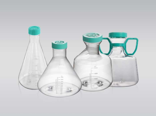 三角培養(yǎng)搖瓶適用于工業(yè)微生物菌種篩選、大規(guī)模發(fā)酵試驗、 種子培養(yǎng)等,是細(xì)胞懸浮培養(yǎng)和培養(yǎng)物收集的理想選擇,同時 也可用于培養(yǎng)基配制、混合及儲存等,相對于培養(yǎng)瓶、皿、轉(zhuǎn)瓶 等,更加經(jīng)濟(jì)實惠。 規(guī)格:125mL 250mL 500mL 1000mL 2L 3L 5L 5L(帶把手) 類型:平底 帶擋板 蓋類型:密封蓋 濾膜蓋 材質(zhì):瓶體聚碳酸酯(PC ) / 環(huán)己二醇(共聚聚酯) (PETG), 瓶蓋高密度聚乙烯(HDPE),濾膜聚四氟乙烯(PTFE),均符 合USP Class VI標(biāo)準(zhǔn)